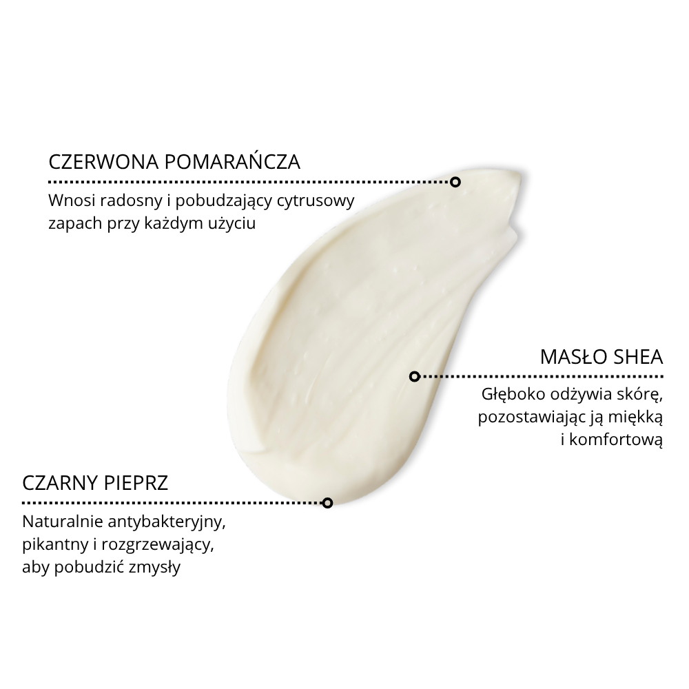 African Orange Aromatic Lotion to nie tylko skuteczna pielęgnacja, ale również aromaterapeutyczna uczta dla zmysłów. Zapach słodkiej pomarańczy i wanilii, przełamany nutami czarnego pieprzu i cedru, otula ciało ciepłym i relaksującym aromatem, który pobudza zmysły i poprawia nastrój.