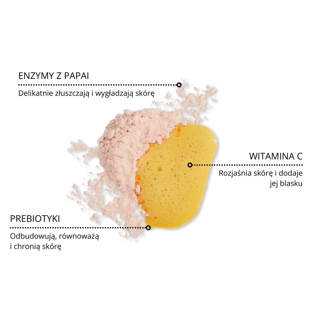 Delikatne złuszczanie i rozjaśnienie: Papaina, enzym pozyskiwany z papai, delikatnie złuszcza martwy naskórek, odsłaniając jaśniejszą, bardziej promienną cerę. Dodatek stabilnej witaminy C w postaci glukozydu askorbylu rozjaśnia przebarwienia, ujednolica koloryt skóry i wspomaga produkcję kolagenu.