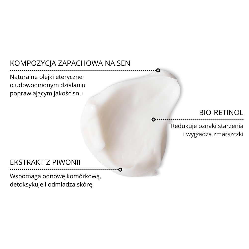 Ten bogaty i odżywczy organiczny krem na noc został stworzony, aby intensywnie regenerować skórę podczas snu, jednocześnie wygładzając drobne linie i zmarszczki. Naturalny ekstrakt z piwonii wspiera regenerację komórek skóry, podczas gdy bio-retinol pochodzący z uczepu owłosionego wygładza i widocznie odświeża jej wygląd. Krem ma nieziemski zapach, który pomaga szybciej zasnąć i poprawia jakość snu, dzięki czemu na pewno obudzisz się pełna energii.