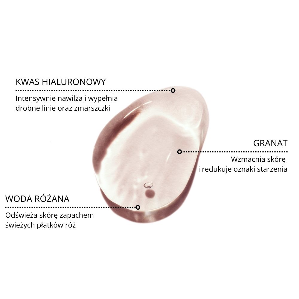 - Woda z róży damasceńskiej* – Wzmacnia naczynia krwionośne, wykazuje właściwości antyoksydacyjne, seboregulujące i łagodzące,
