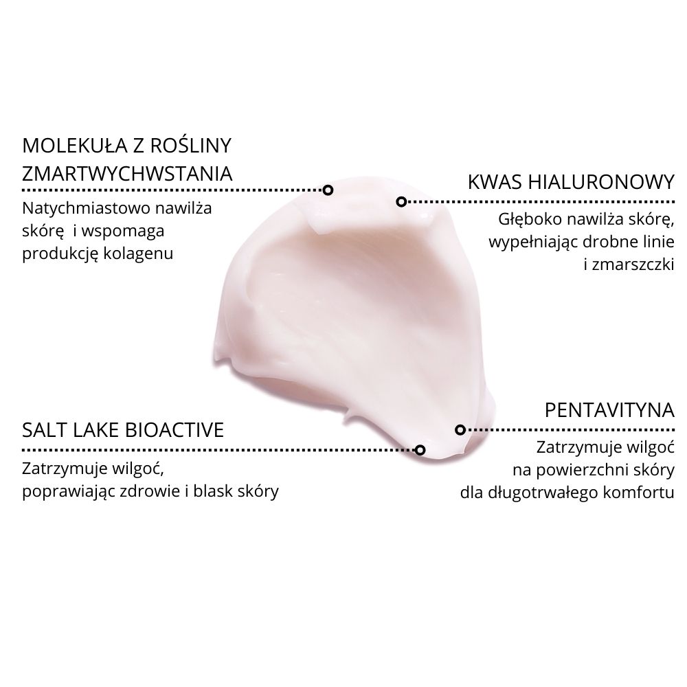Bogata, otulająca formuła natychmiast wnika w skórę, dostarczając długotrwałego nawodnienia i zatrzymując wilgoć tam, gdzie jest najbardziej potrzebna. 🌊 Efekt „desert oasis” – bioaktywne bakterie ekstremofilne z solanek wspierają zdolność skóry do wiązania wilgoci i przywracają jej naturalną równowagę, sprawiając, że cera odzyskuje elastyczność i świeżość, jak po kąpieli w odżywczym, mineralnym źródle.