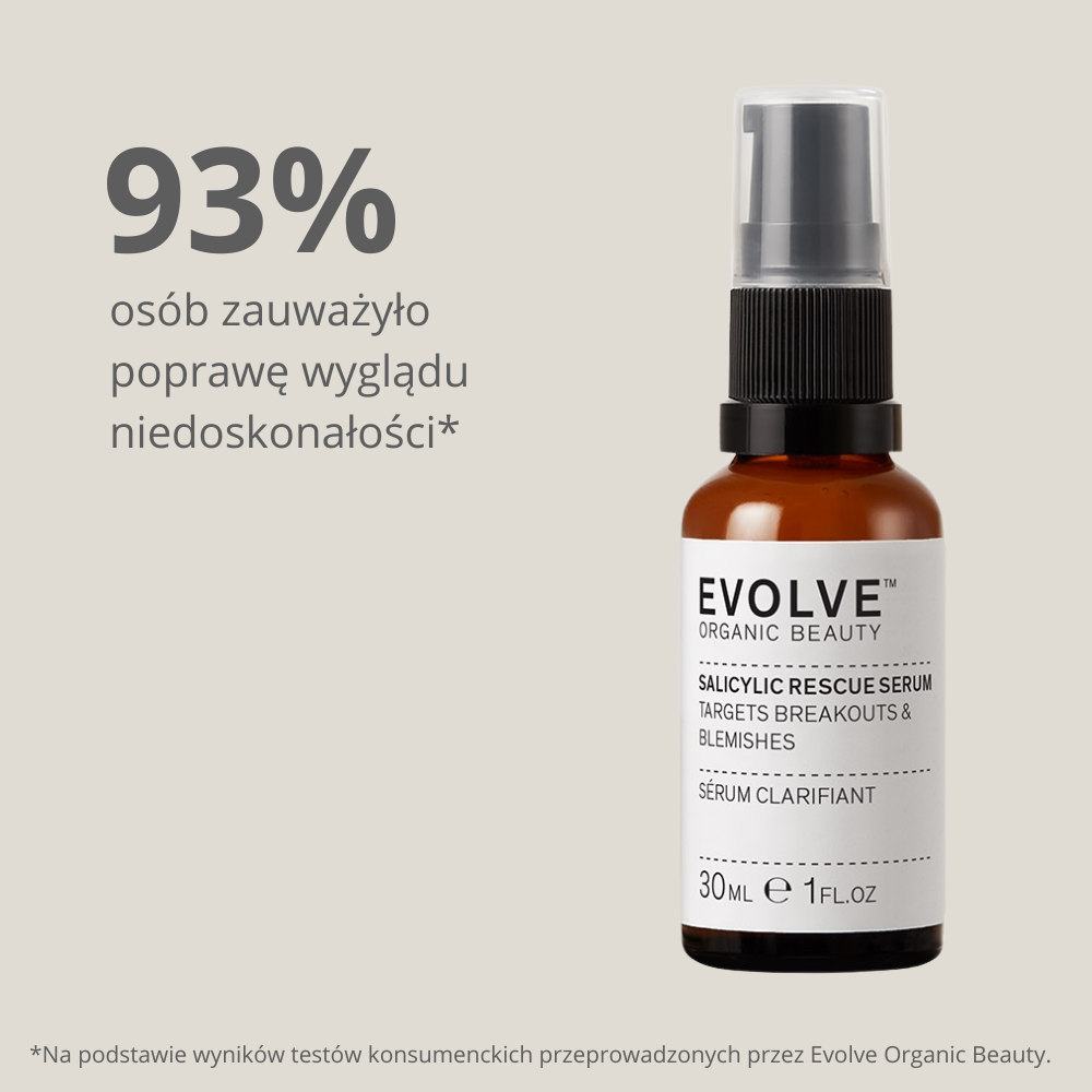 Evolve Organic Beauty – Salicylic Rescue Serum – jest zalecane do skóry z niedoskonałościami, zatkanymi porami, a także do skóry tłustej i mieszanej. Zmniejsza widoczność zanieczyszczeń skóry, zapewniając piękniejszą cerę i chroniąc ją przed czynnikami zewnętrznymi.