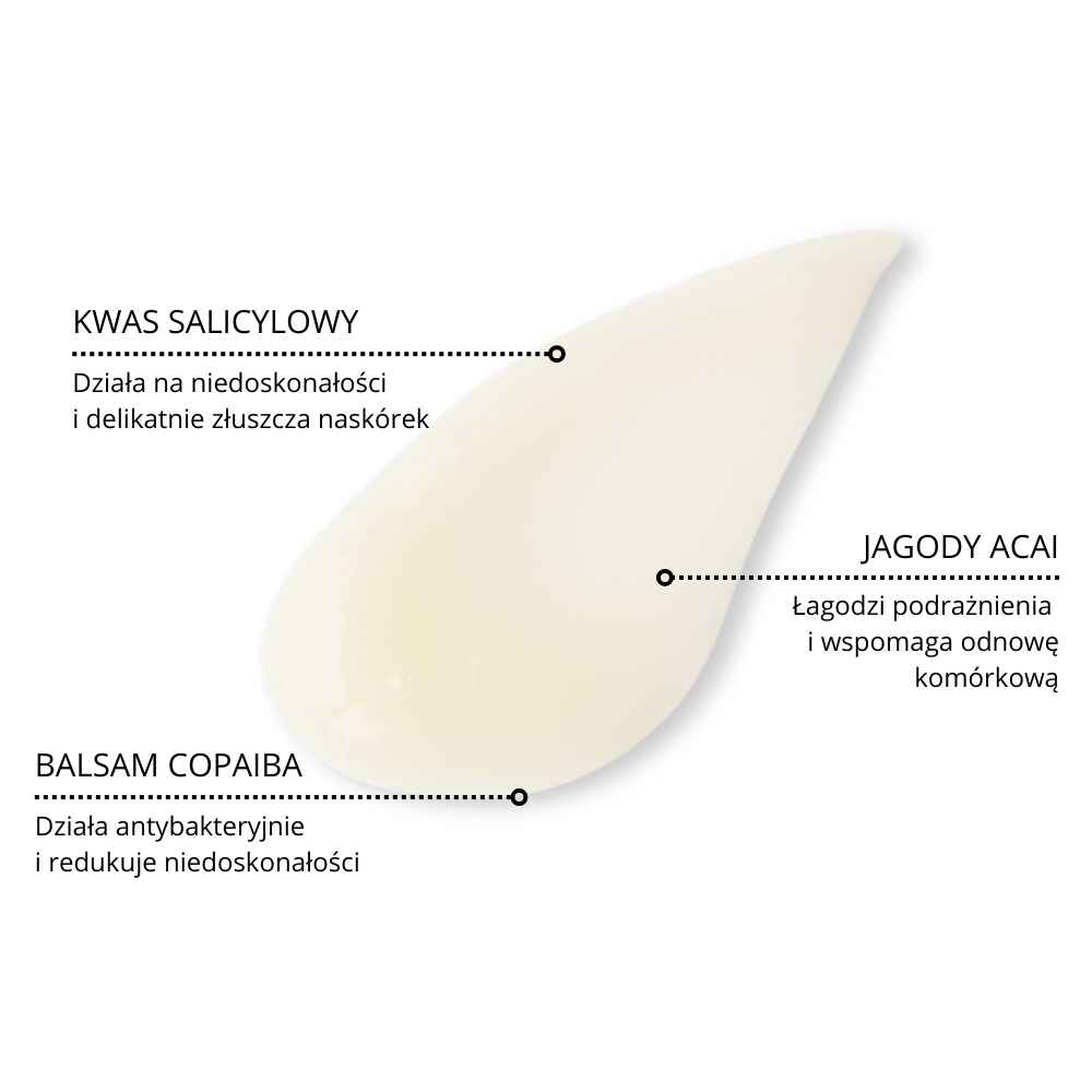 • Ekstrakt z kory wierzby czarnej – delikatnie złuszcza naskórek, oczyszcza ujścia gruczołów łojowych, usuwa nadmiar sebum. Zapobiega powstawaniu trądziku, łagodzi stany zapalne i zaczerwienienia.