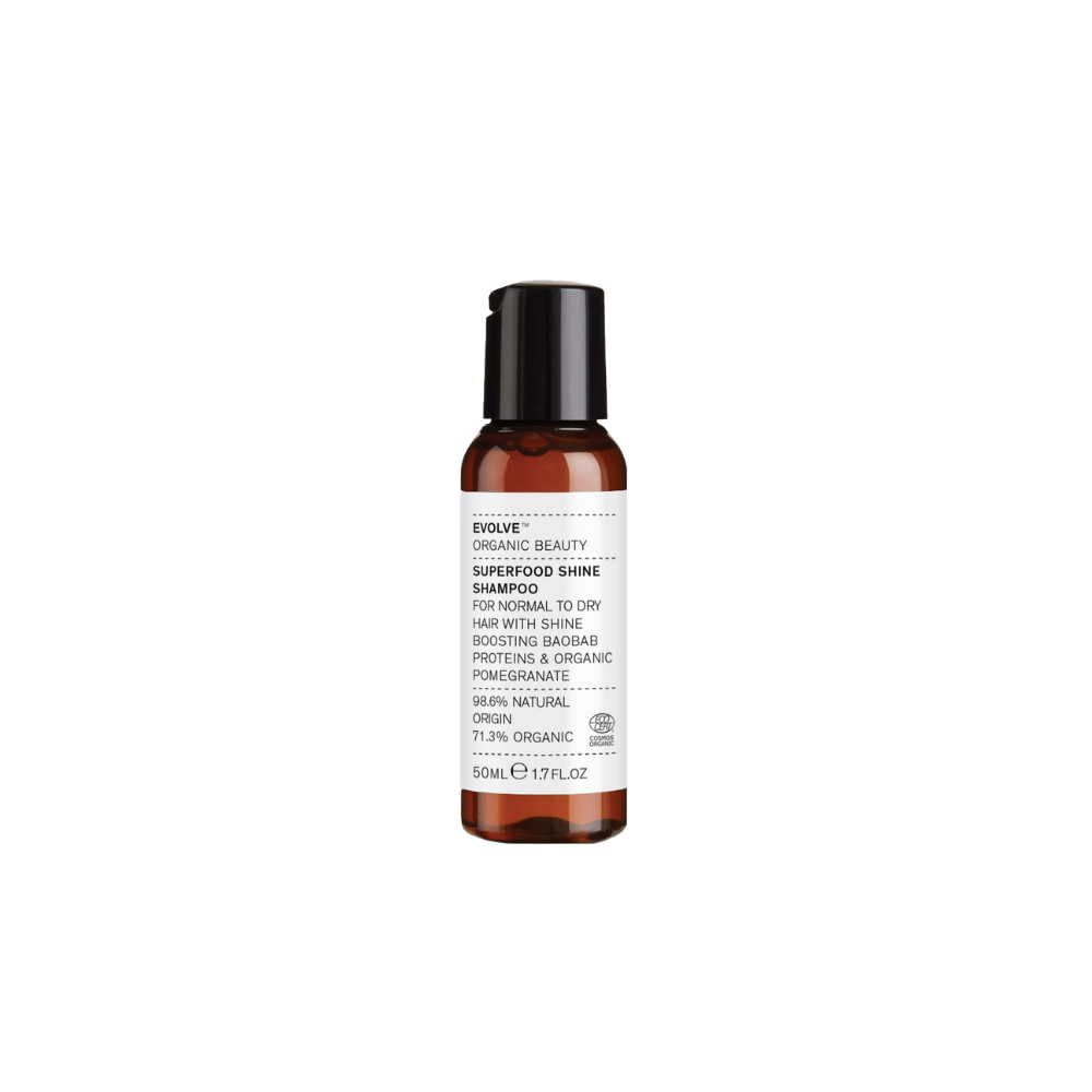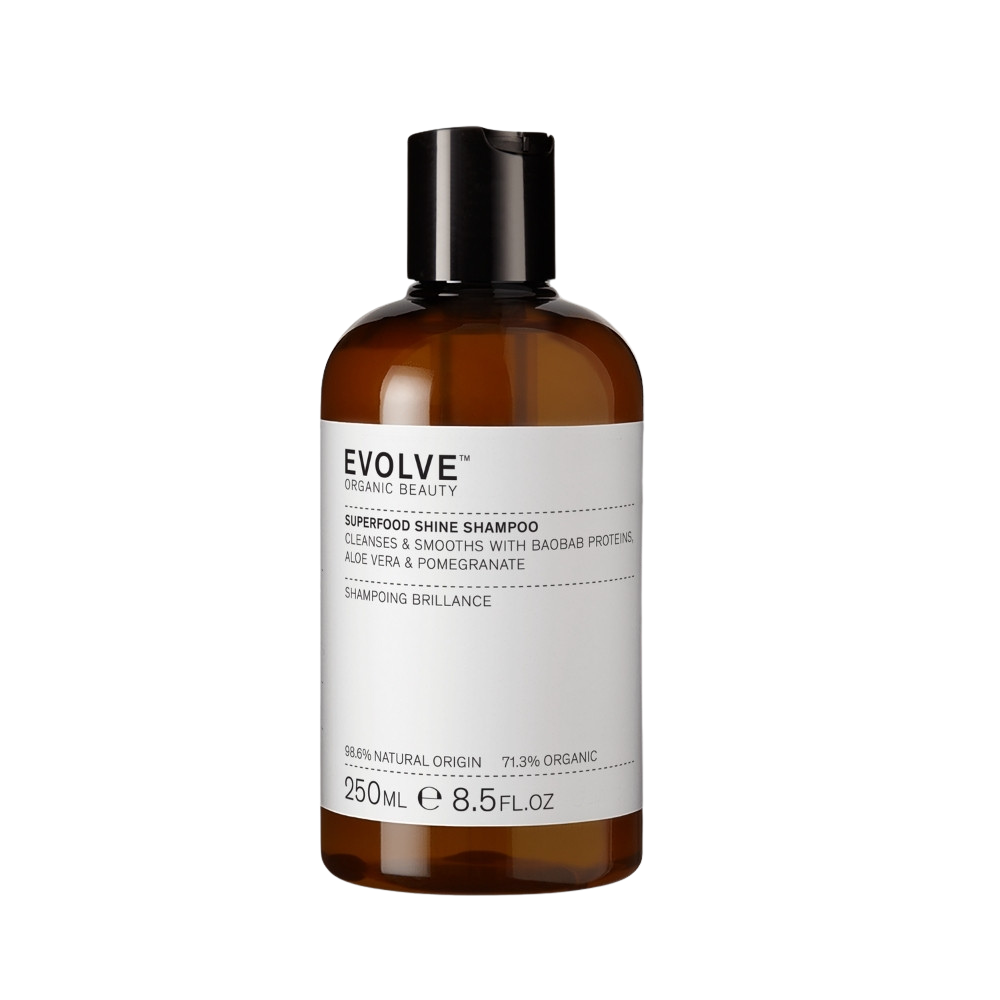 Evolve Organic Beauty – Superfood Shine Natural Shampoo – szampon, który delikatnie oczyszcza włosy i skórę głowy, nie naruszając ich naturalnej równowagi. Składniki zwiększają połysk i siłę, jednocześnie chroniąc pasma. Zmniejsza puszenie się włosów, poprawia ich podatność na układanie, nadając im większą gładkość.