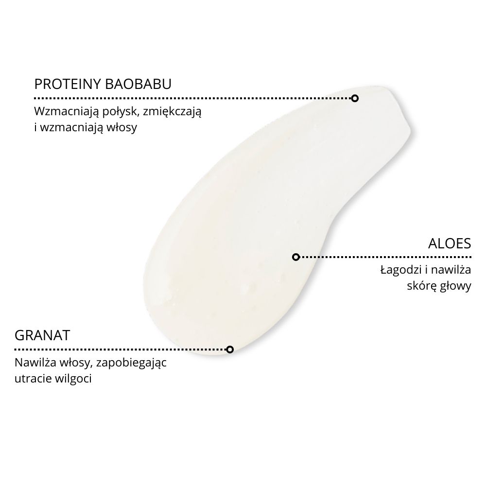 • Hydrolizowane proteiny z nasion baobabu afrykańskiego – składnik ten jest przykładem doskonałego emolientu, dzięki czemu nawilża i uelastycznia włosy. Posiada właściwości przeciwzapalne i łagodzące.