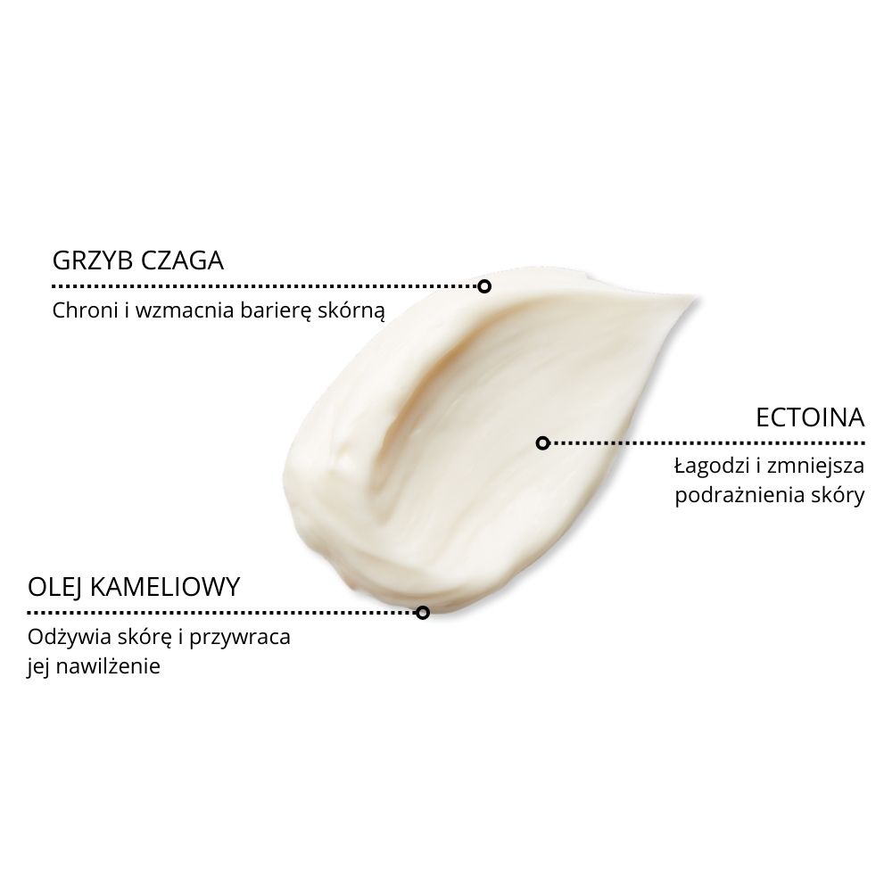 Ektoina, znana ze swoich właściwości ochronnych, działa jak tarcza, chroniąc skórę przed szkodliwymi czynnikami zewnętrznymi. Ekstrakt z grzyba chaga pomaga wzmacniać naturalną barierę ochronną skóry, jednocześnie wykazując działanie przeciwutleniające. Olej z nasion kamelii głęboko nawilża i zmiękcza skórę, redukując zaczerwienienia. Hialuronian sodu, jako naturalny środek nawilżający, intensywnie nawadnia skórę, poprawiając jej elastyczność. Masło shea, bogate w witaminy i kwasy tłuszczowe, odżywia i regeneruje, zapewniając skórze długotrwałe uczucie komfortu.