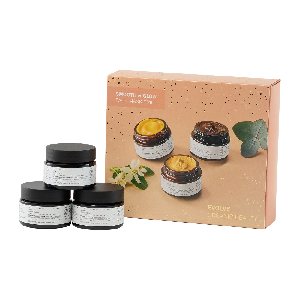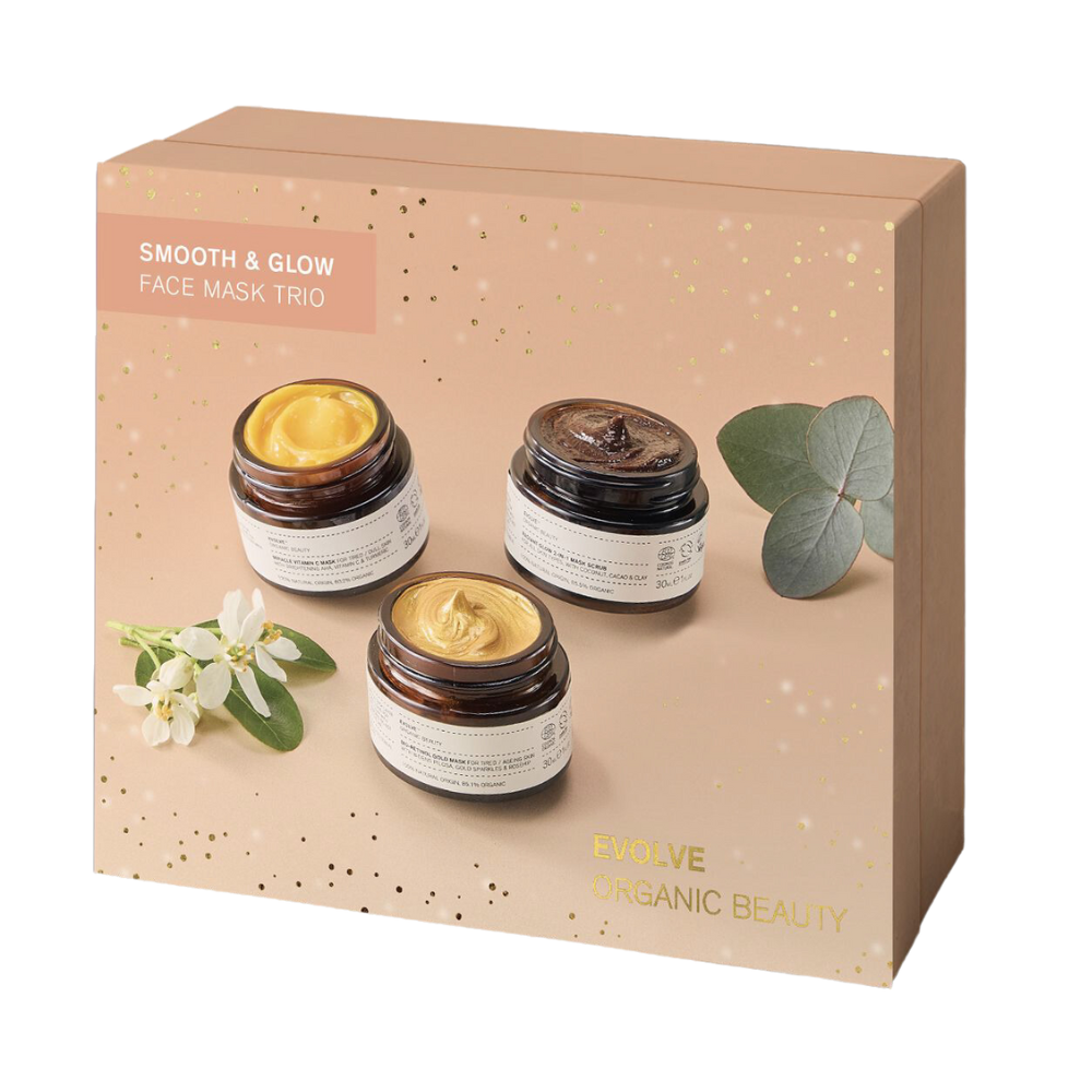 Evolve Organic Beauty – Smooth & Glow – podaruj skórze trio luksusowych, naturalnych i organicznych masek do twarzy, stworzonych, aby złuszczać, wygładzać i regenerować, nadając naturalny, zdrowy blask. Odpowiednie dla każdego typu skóry. Pozostawiają skórę miękką, komfortową i pełną blasku!