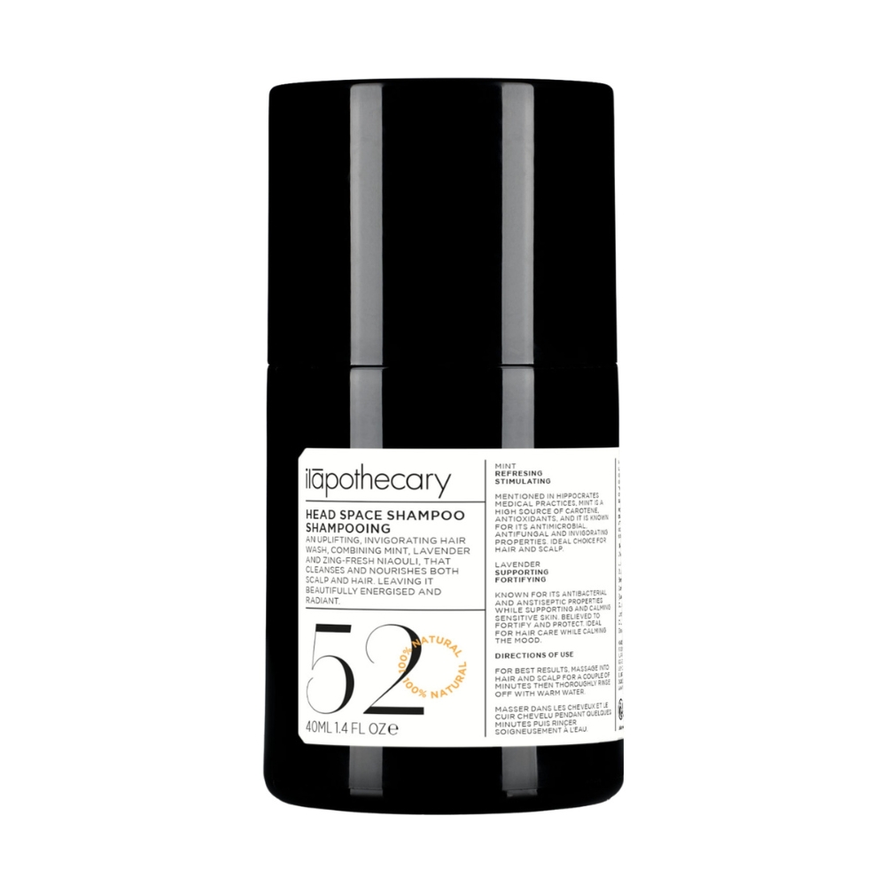 Ilapothecary – Head Space Shampoo – szampon, który oczyszcza bez podrażnień i przywraca równowagę skóry głowy. Kojące olejki z lawendy, tymianku i mięty odświeżają, łagodzą i dają uczucie lekkości – od nasady aż po końcówki.